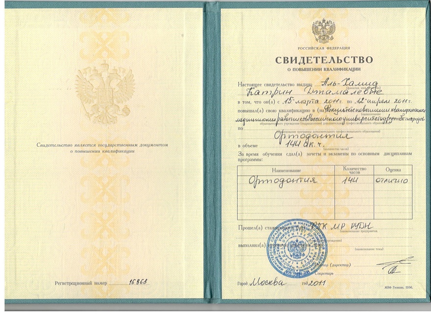 2003-2005— Проходила ординатуру по специальности "Ортодонтия" в ЦНИИС (Центральный Научно Исследовательский Институт Стоматологии)