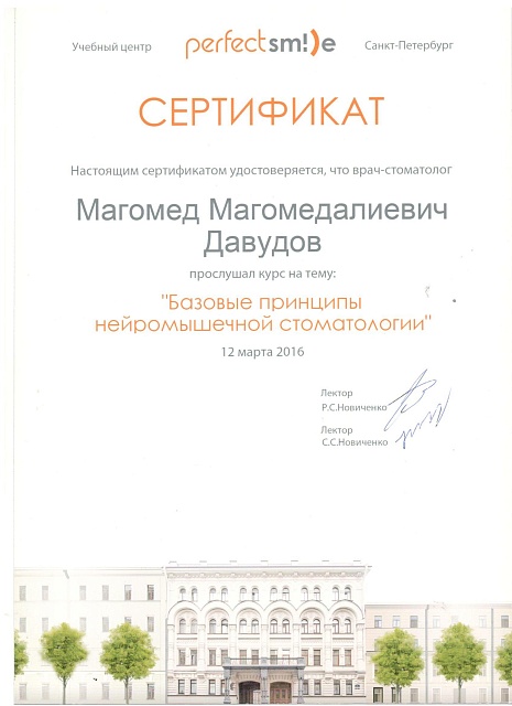 2013 г. – "Основные базовые принципы гнатологии" Московский международный образовательный центр в области стоматологии